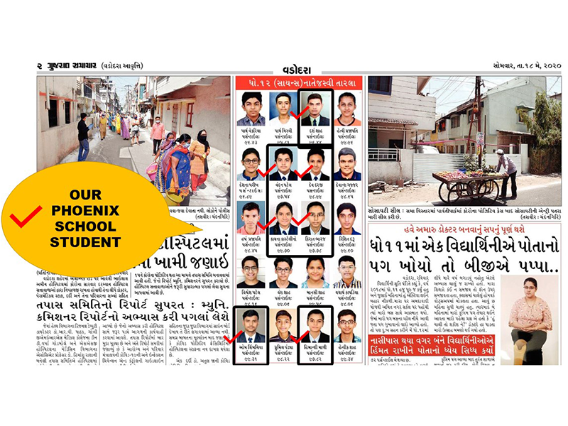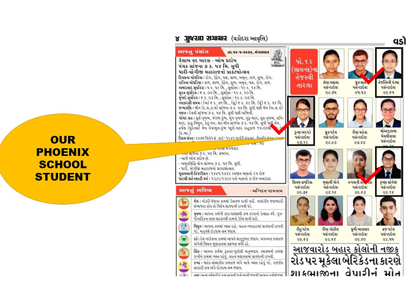 • From Nursery to JEE/NEET: A Complete Educational Journey at Phoenix | More than 20 students Rank 600+ in NEET 2024 | More than 74 students have A1 Grade and 168+ Students have A2 Grade in SSC 2024 | Grand Success in JEE MAIN 2024 | 74 Students Qualified for JEE ADVANACED | 15 Students with A1 Grade & 61 Students with A2 Grade in SSC 2023 | Admission Open for STD 6th to 12th (science) | GET BOARD 2021 SAMPLE PAPER WITH REDUCED SYLLABUS IN SAMPLE PAPER SECTION | Phoenixian achieve an outstanding results : 10 STUDENTS Achieve A2 Grade With 97+ PR Rank in HSC 2020 BOARD EXAM | 47 STUDENTS SCORING MORE THAN 90+ PR Rank in HSC 2021 BOARD EXAM | 89 STUDENTS SCORING MORE THAN 80+ PR Rank in HSC 2021 BOARD EXAM |4 STUDENT SCORING MORE THAN 99+ PR in SSC EXAM 2021 | 84 STUDENTS SCORING MORE THAN 90+ PR in SSC EXAM 2021 | 35 STUDENTS SCORING MORE THAN 80+ PR in SSC EXAM 2021 | 4 STUDENTS Ranks 600 Above IN NEET 2021| 17 STUDENTS Ranks 400 Above in JEE NEET EXAM 2021 | 4 STUDENT SCORING MORE THAN 95+ PR in JEE MAIN EXAM 2021 | 27 STUDENTS SCORING MORE THAN 90+ PR in JEE MAIN EXAM | | TIMES ICON OF VADODARA 2021 : WE ARE AWARDED BY THE TIMES OF INDIA TAGGING WITH BEST SCIENCE SCHOOL AND INSTITUTE FOR JEE/NEET/GUJCET/FOUNDATION